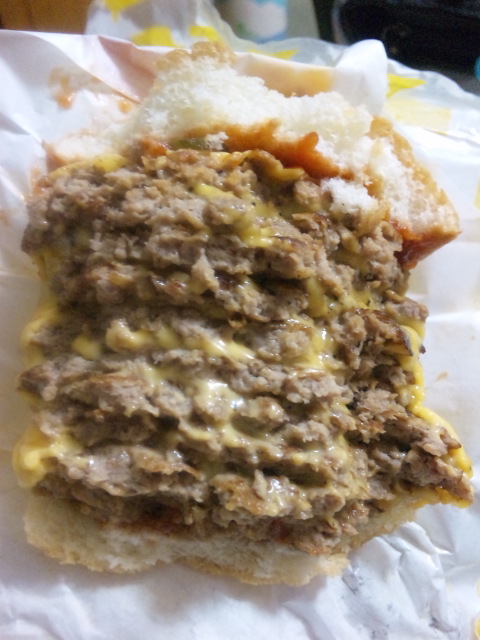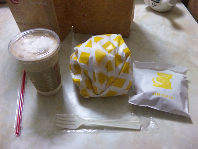 バーガーの見た目はもう哀れなものですよ。やっつけ仕事かと。上のパンなんか、最初ッから上に置く気なかったみたいだしね。(´・ω・`)ベレー帽みたいになってますよ。