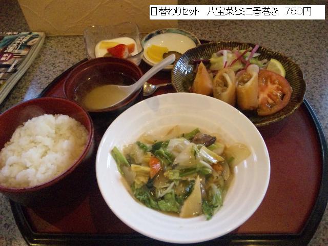 八宝菜とミニ春巻き。それにご飯と汁物と漬物、デザートに杏仁豆腐がついております。